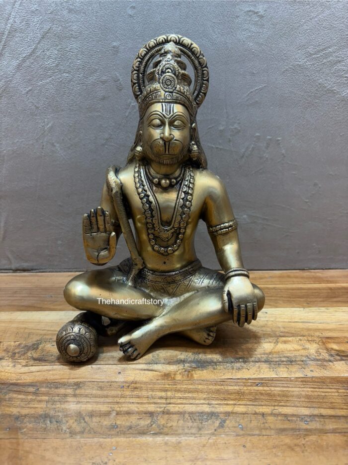 This serene brass Hanuman idol in sitting pose reflects calm strength and unwavering devotion. Finished in a rich golden antique tone, it’s perfect for invoking divine protection and devotion in your sacred space or meditation area.