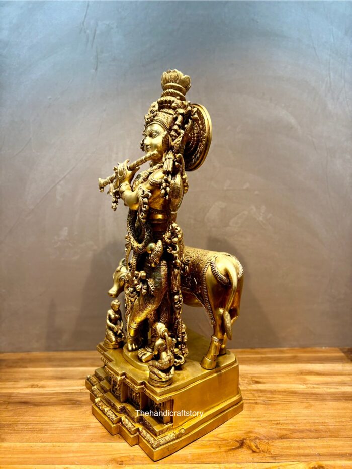 • Depicts Lord Krishna playing the flute beside his beloved cow