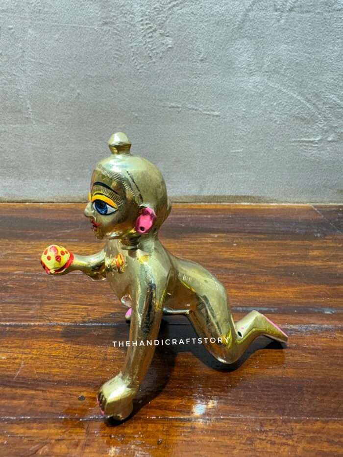 • Solid brass Bal Krishna in classic crawling posture, holding a laddu.