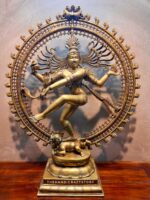This grand brass Natraja idol in antique yellow golden finish exudes powerful energy and spiritual rhythm. Lord Shiva’s dance of creation is beautifully rendered in exquisite detail, symbolizing the cosmic cycles of creation and destruction. A magnificent piece for both worship and art lovers.