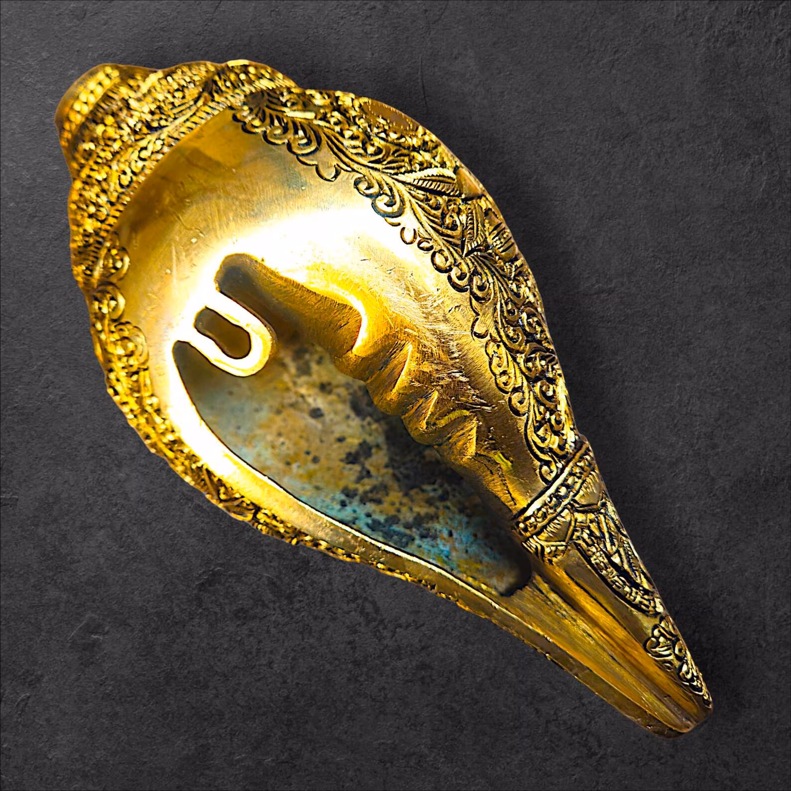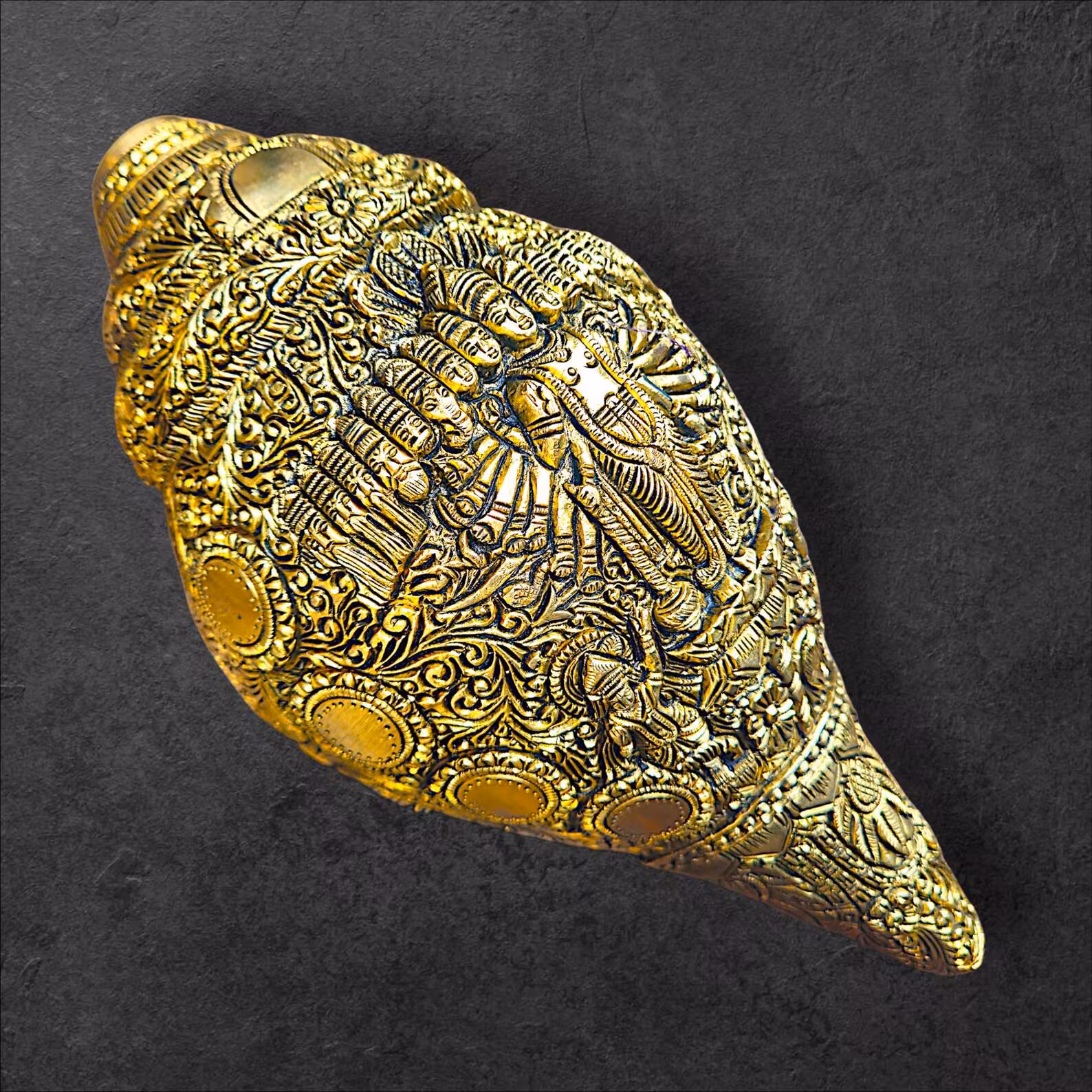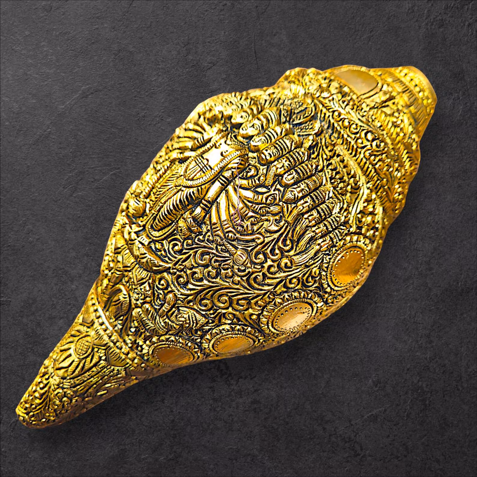 • Handcrafted brass wall hanging featuring Dashavatar carvings on sacred conch
